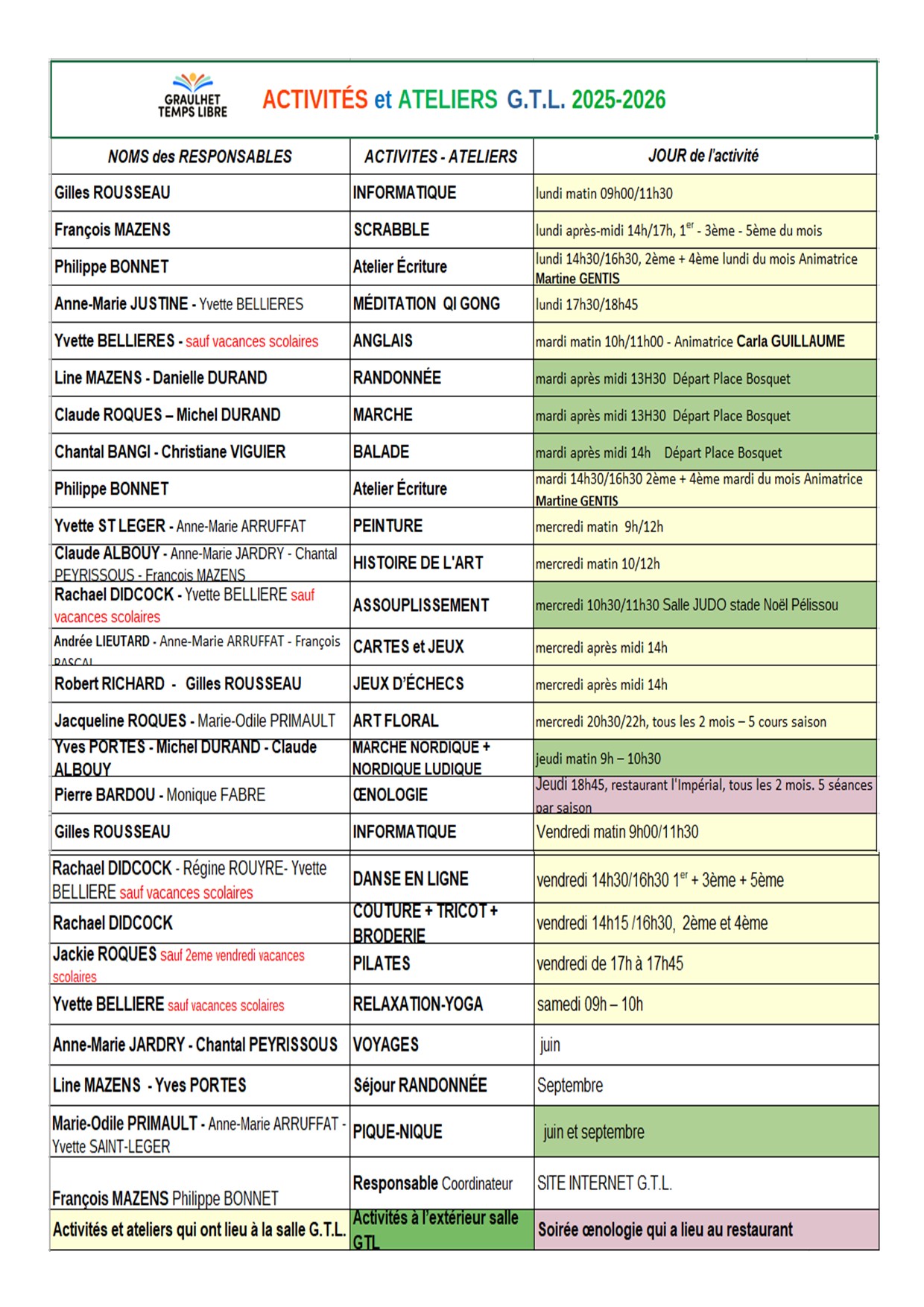 A Graulhet Temps Libre, notre priorité est d’offrir à nos adhérents des activités riches et variées, adaptées à leurs envies et besoins. Pour cela, nous nous appuyons sur une équipe de responsables dynamiques et passionnés. Voici la liste des responsables et des activités qu’ils coordonnent :