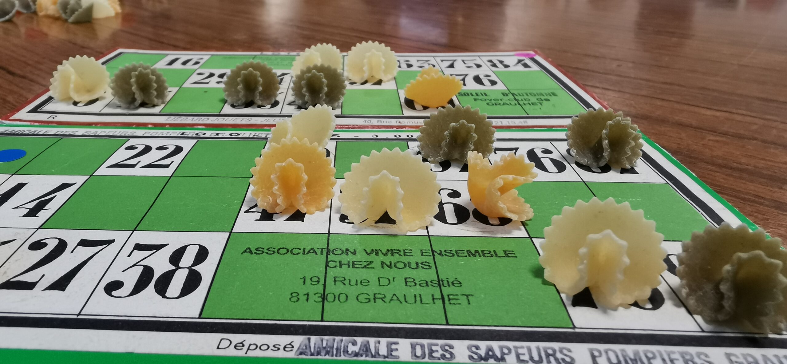 Le célèbre boulier pour le tirage des numéros….on marque sur les cartons les numéros sortis avec des ….pâtes !