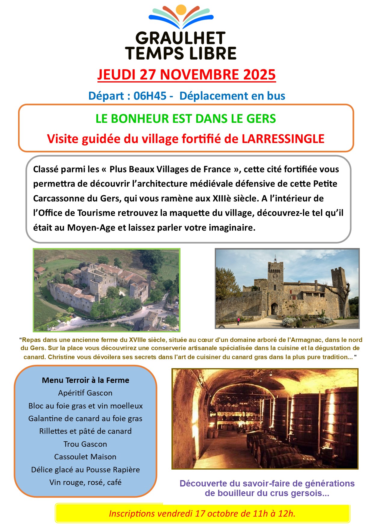 Sortie à la journée: « Le bonheur est dans le GERS » avec Menu Terroir à la Ferme – jeudi 27 novembre.